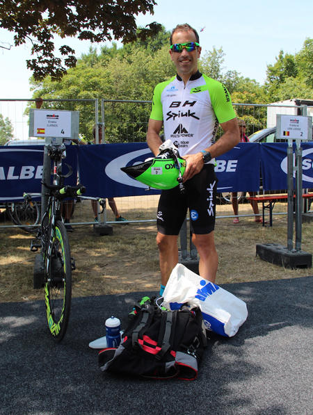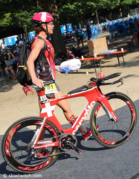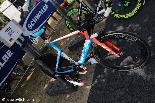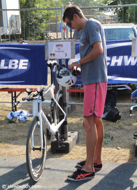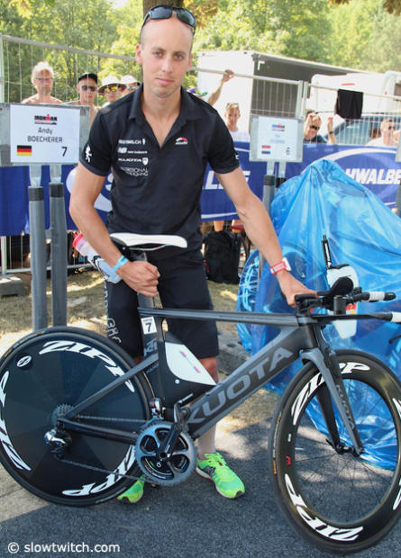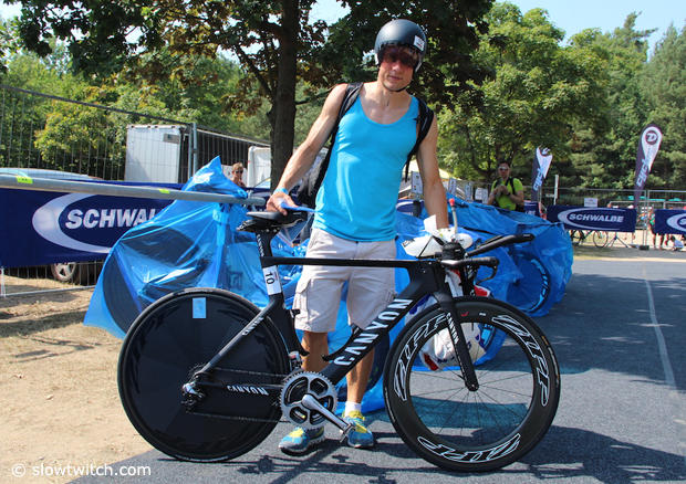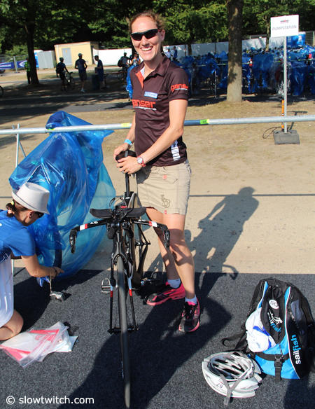 Andreas Raelert was one of the other early arrivals at the Langener Waldsee to check in his Cube race bike.