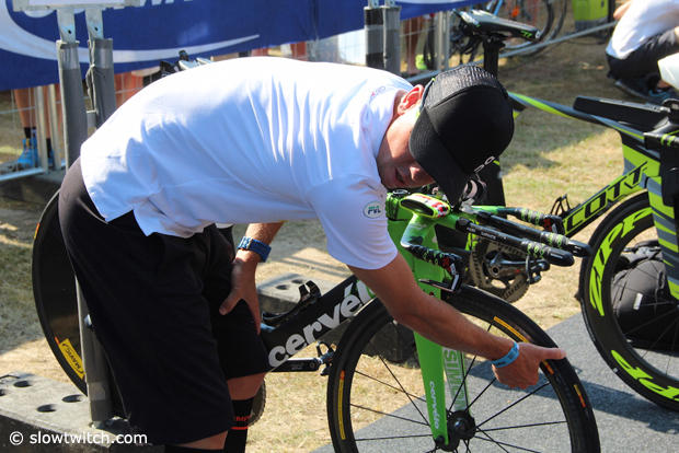 Frederik Van Lierde checks his tire pressure before darting away to put his feet up.