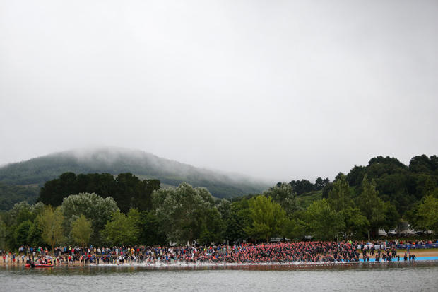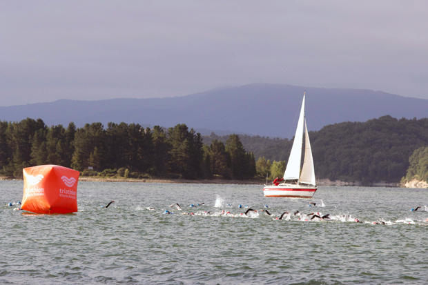 The first athletes are already on the scenic bike course, others are still working on the swim segment.