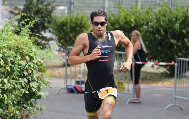 An interesting side note to this story is that Hörmann (pictured below running during the 2015 Karlsfeld Triathlon) also won that race in 2013 after crossing the line in second place. The rules in Karlsfeld state that athletes can’t clip their shoes into the pedals “unless their feet are in them,” a rule that was put in place because of a dangerous exit and entrance of the transition area. While in the lead, Andres Carnevali jumped off his bike as he reached the T2 dismount line, but left his bike shoes clipped into the pedals. He then crashed in view of officials as he “illegally dismounted,” and was thus disqualified. But Carnevali did not learn about this until he crossed the finish, and Hörmann was declared the winner. Both athletes remained friendly as Carnevali accepted the ruling, and the two even shared a meal post race that day, cooked by their respective girlfriends.