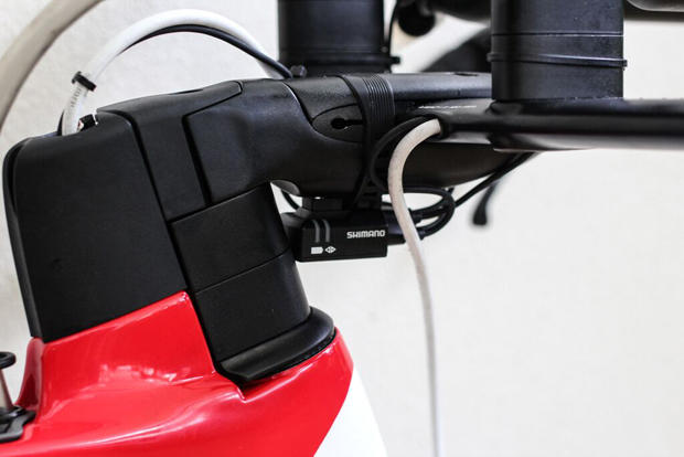 On his extensions Betten only shifts the rear derailleur with this 1-button Shimano Dura-Ace setup.