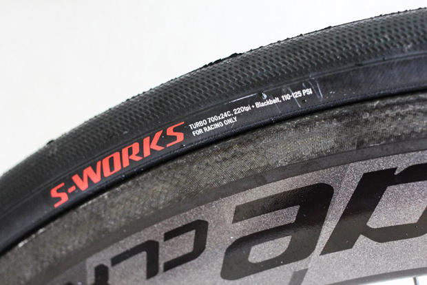 Betten rides 24mm Specialized S-Works Turbo tires front and back, with STANS sealant inside the Specialized tubes for races. The front wheel is Roval and the rear is a Zipp disc.