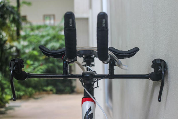 Betten replaced the Magura brakes with Shimano ones, and uses a Zipp Garmin mount on his extensions.