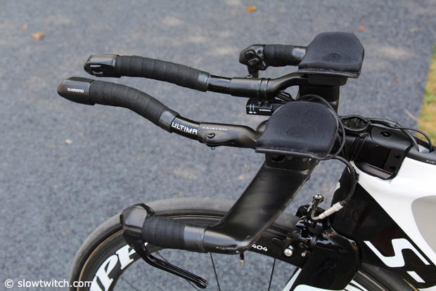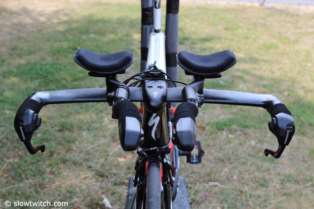 Pedersen rides with 2-button Shimano Dura-Ace Di2 shifters on the extensions.