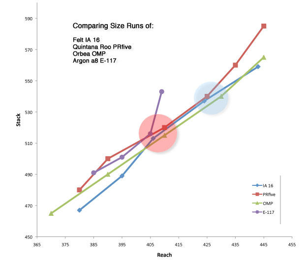 A lot of Slowtwitchers have seen charts like this. Imagine (0,0) on this chart hovering over the bottom bracket spindle. Every point along those colored slopes is a discrete size. In the red circle is an aggregation of sizes where all 4 of these bikes agree. Size Mediums in all these bikes (52cm in the PRfive) are about the same. They are close to identical, geometrically. They will fit the same. They're right about 515mm to 520mm in stack and 405mm to 410mm in reach.