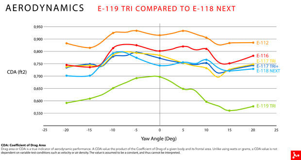 How fast is this bike? Below are a pair of wind tunnel test graphs provided to me by Argon 18. It's interesting comparing all these graphs provided by manufacturers, to see if Argon 18's results on, say, the P5 and Speed Concept comport with what QR, Felt, et al have to say about the Cervelo and Trek bikes. QR's testing finds the SC a bit better in a yaw versus the P5 than does Argon 18's test here. Maybe QR's tests had the Speed Box on the SC, or had it in some way configured to present more surface area.
