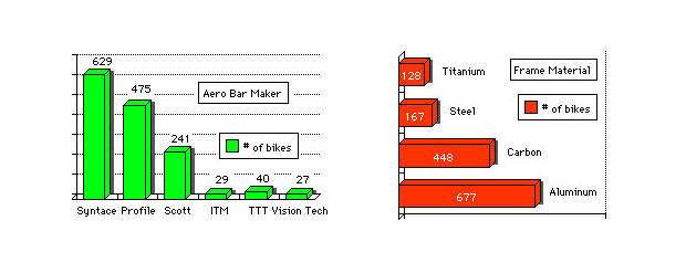 Most of the bikes were aluminum, that is due to the large numbers of Cannondales, Principias, QR's, and Softrides. But there were a lot of "off-brand" aluminums as well, some very nice bikes. It seems that frame material has reached down to the level of the smaller custom frame builders.