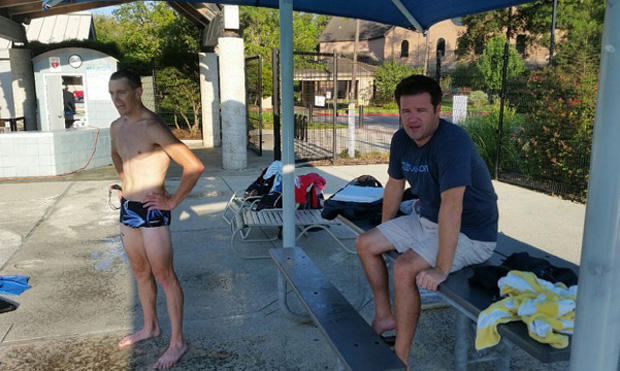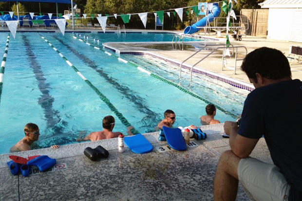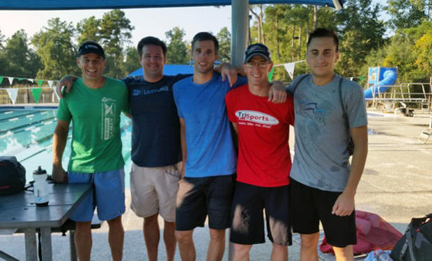 Floyd rented out additional pool time in September, and Hanson has training partners, which is quite different than his solitary training back in Iowa. Swimmers pictured here from right: Cody Beals, Hanson, Balazs Csoke, and Nils Frommhold.