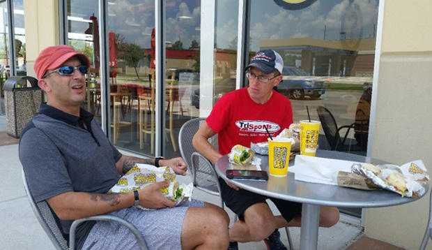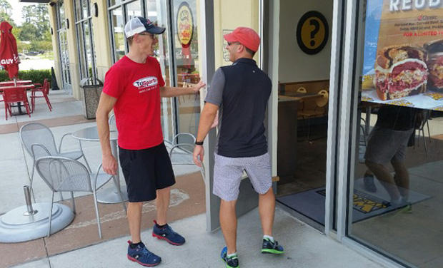 Finished with workouts for the day, Hanson and Tilbury-Davis meet for sandwiches. Notice how Hanson holds the door out of respect for his coach!