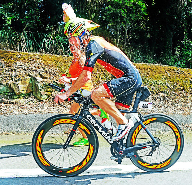 Michael Coughlin dumps cool water over his head on the final climb of the day.