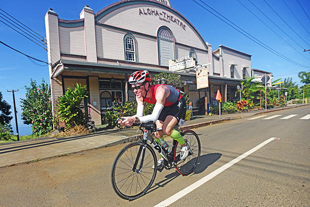 Michael Owen rides past the Aloha Theater 15 miles into the bike course.