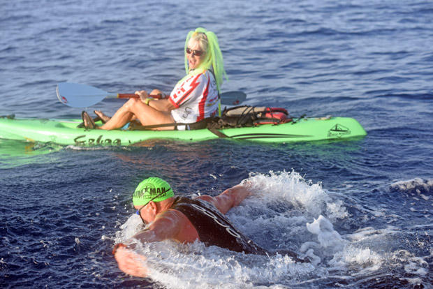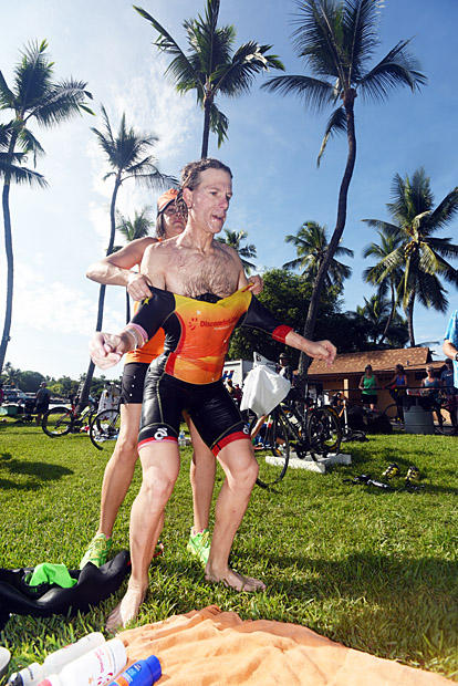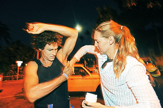 Mel Gorman, 11th in the Olympic 10 kilometer open water swim and an Ultraman crew member, applies Body Glide to David Kalinoswki before the swim.