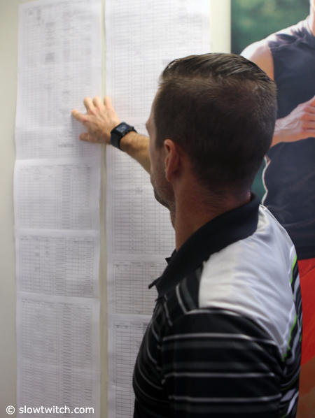 Chris Eschbach checks out a list where they keep track of mechanical design, sensor technology, and other details of the prototypes. But here Eschbach is focused on different sensor technology. He assured us that all of that info is digital too, but they enjoy this quick access.