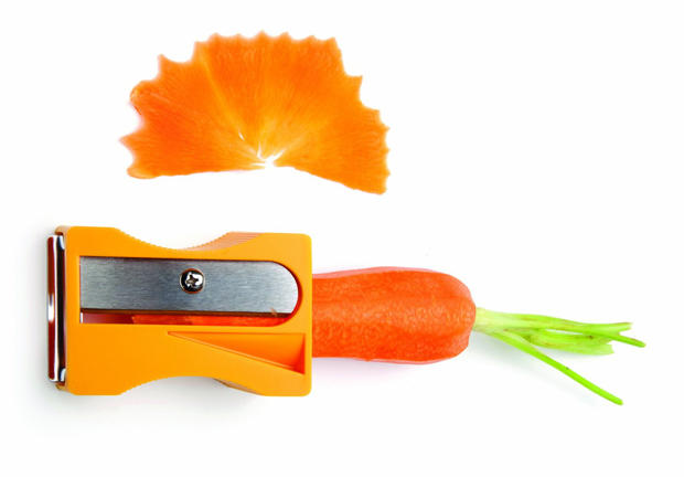Cutting into one of your fingers or the palm of your hand with a vegetable slicer is not fun, and that is for sure. The clever Karoto slicer by Avichai Tadmor is the right tool to handle carrots and a few other phallic veggies. The carrots can't be too big, otherwise they won't fit into the opening of the Karoto. But the carrot or cucumber shavings will look good on your sandwich or your salad.