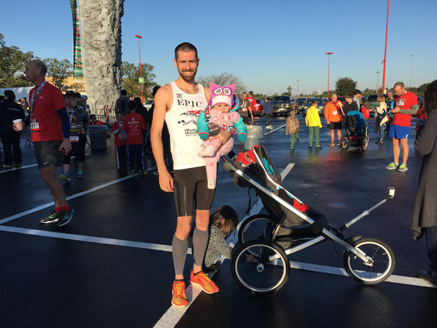Calum: My wife was really supportive, she loves it when I can take the kids with me on my runs. On race day she was a key part of the team helping get everything ready, thankfully Holly always wakes up happy even though it was a little earlier than normal. It was a little cold that morning so my wife hopped in the car after watching the start and was following our run via the live Periscope footage. She was really happy to see Holly clapping and could hear her happy little voice so that was comforting. I think she turned it off toward then end when Holly started to fuss but we were also within 10 minutes away from the finish well under record pace so she made her way to the finishing chute with our eldest daughter, my mom, and my sister. I think the whole experience, especially the aftermath, has been a bit of a shock to all of us but her especially- standing on a finish line getting photo's taken, being interviewed on the news, and the social media impact. Her Instagram photo of us coming down the chute fist pumping was the original picture to be circulated and its made it way around the world a few times now, just crazy. She's earned some major street cred now with the Canadians in Katy mothers group, so she's having fun with it too.