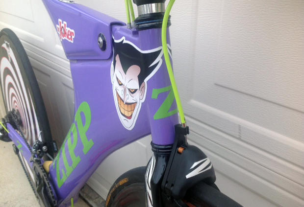 The Joker sticker at the front of the bike will grin at you when Grogan rolls by.