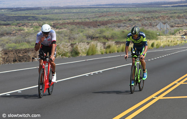 Luke McKenzie and Tim Van Berkel moved into the lead, and after the turn at Kawaihae and the ensuing gentle-but-lengthy ascent Frodeno spent a lot of time out of the saddle and on the pursuit bars. It looked like he was struggling, but on further inspection this seemed his posture whenever he was in danger of creeping into the draft zone of the rider in front of him.