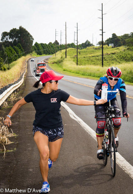 Last year Jeff Shilt and Marian Brennan were on my crew in Canada. Unfortunately they weren’t able to make it to Hawaii. I was extremely lucky that my great friend Janine Kaye made the trip. Janine is an Ironman athlete and is one of our awesome coaches at GKEndurance. Her job was meal preparation, calorie counting, preparing bottles of GU and nutrition for each day plus driving and aid station handoffs!
