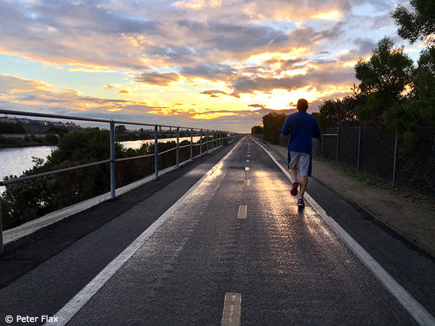 Peter Flax who works as a features editor at the Hollywood Reporter grabbed this picture on his bicycle commute in Marina del Rey, CA, the runner in the picture just happened to be there.