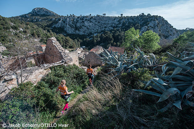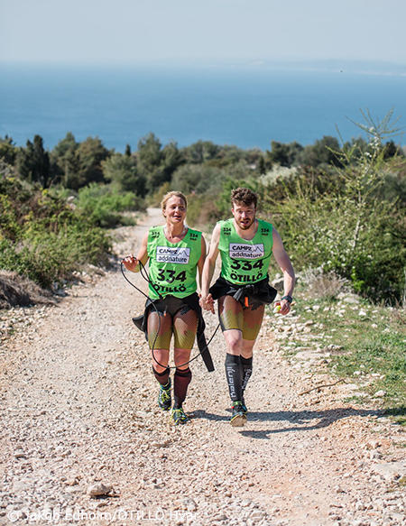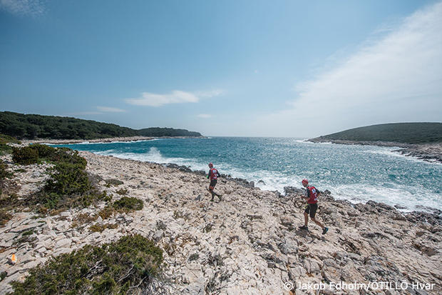 The French mixed team of Caroline Dewaele and Nicolas Dewaele run along the coast near Hvar on fairly tricky terrain.