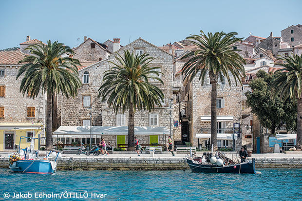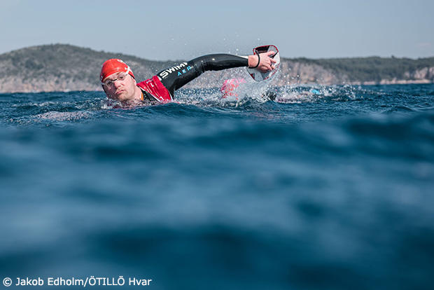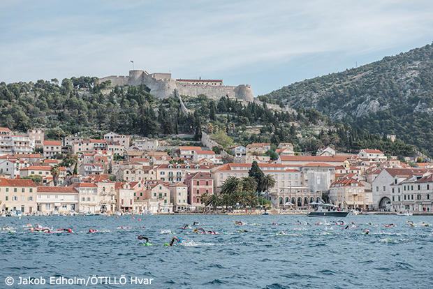 Teams of two from all over the world swim past the downtown of Hvar and the Hvar castle looming above.