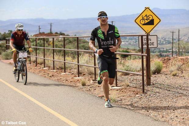 With the first clue that Brownlee was at all vulnerable, Sanders took back 20 seconds from the leader 2.4 miles into the run, while Kienle gave back another 20 seconds. At that point, Brownlee was averaging 5:48 per mile in one of the sections with demanding hills. At mile 6, Sanders stayed at an even pace with Brownlee, 2:44 back, while Kienle fell to 4:16 arrears. Ben Kanute held even with Tim Don at 6:25 back while Costes (+8:36), Appleton (+9:13), Laundry (+9:43) and Brent McMahon (+10:10) stayed in the top 10 but out of contention for the win.