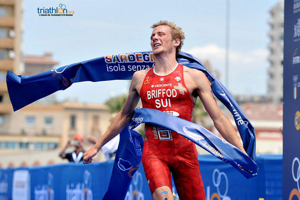 Briffod had a much harder time earning his first World Cup win. He left the water in 20th place, 28 seconds behind the swim leaders, 2016 WTS Grand Final winner and Rio Olympic bronze medalist Henri Schoeman of South Africa and Anthony Pujades of France. By the second lap of the hilly bike course, the two leaders were joined by four chasers including Briffod, Stefan Zacheus of Luxembourg, Charles Paquet of Canada, and Andreas Schilling of Denmark. By T2, the pack of six had a 30 seconds advantage on the field.