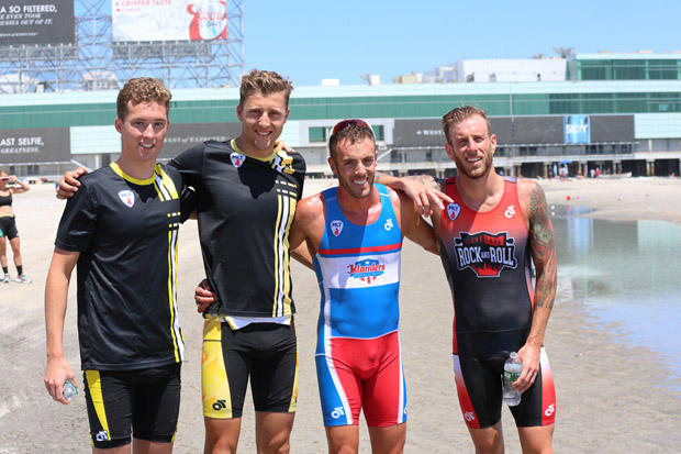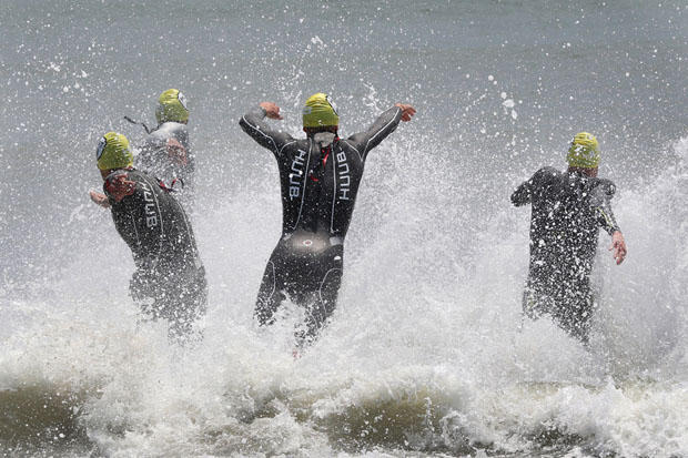 Dan Feeney (left) and John Rasmussen (right) enter the water in their HUUB Design suits. All four members of the teams complete the swim-bike-run course which is contained within one square mile for ease of spectating.