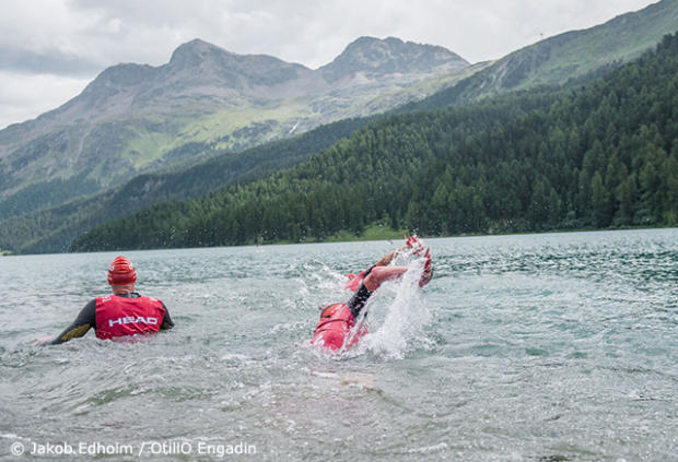 I arrived in Silvaplana, Switzerland on Thursday, July 6th and Carson joined me a day later. That afternoon we spent a couple hours exploring the first 2 run segments of the race, plus we swam that first swim segment in Lej Cavloc and got to test out the SwimRunners tether system in very cold 48 degree water. The tether worked great, and we seemed to match up very well in terms of running speed, goals and expectations. I was also happy that the ML prototype Huub Swimrun wetsuit that I had brought from the USA fit Carson like a glove.