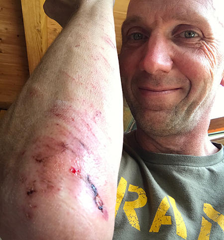 The 7th swim was the longest with a length of 1,400 meters and a storm arrived during that segment. The lake got very choppy and with such a long exposure you could really feel the 55 degree water temperatures. According to Carson this was the only swim where he could feel the "pull of the tether." But he then said that it was more so the current and not the German guy attached to him by the hip. I came out of that swim feeling cold and with somewhat wobbly legs, but when I looked around I noticed no other team nearby. We grabbed some food and drinks at that aid station and then moved on to the final climb of the day. All of the sudden I noticed a team running towards us and still slightly dizzy from the swim I thought that maybe we had gone wrong. We continued running in that direction, but I turned around to make sure we did not have to go somewhere else. I then tripped and fell and hit the gravel path very hard. I busted open both palms of my hand and my right elbow and forearm was a bloody mess. My left knee was also scraped open, but the biggest pain was surely that right elbow and right hand. The volunteers nearby rushed over and offered assistance but I was stubborn and said I was ok. I also noticed that the team running towards us was one of the front running teams (German Sparkle Party in 5th place overall) returning from that climb and about to start their final swim. So yes, we were going the right direction but I was now hurting and felt a bit nauseous. We slowly continued and Carson was very calm and supportive. But I decided to climb back into the lake to wash all the gravel and dirt from my open wounds. I felt terrible, and wondered if this was the end of our race, but there is no crying in Swimrun. Plus I did not want to disappoint my teammate. He had made a big effort to race with me and I surely could not stop now. So we continued. I had a compression bandage with me (required gear) but I thought it would be wasted on my elbow considering that we still had one more swim in front of us.