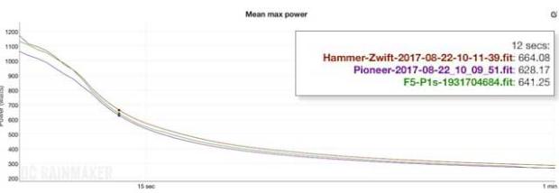 After a 20-minute warmup and zero offsets I compared the claimed power accuracy of the Hammer (+/- 3%) versus the PowerTap P1s (+/- 1.5% claimed) and the Pioneer 9100 series power meter (+/- 2% claimed) at a number of intervals including 1000+ watts, 300 watt efforts and recovery at 150 watts. Such comparisons are not necessarily apples to apples but they can provide some clues towards tendencies.