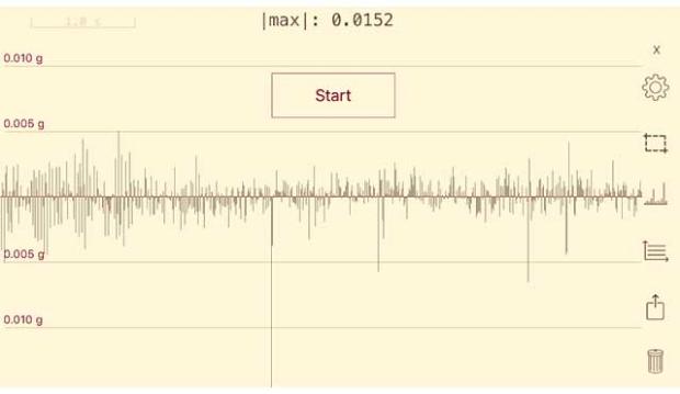 Vibration is a topic often mentioned as influencing the sound made by indoor trainers, particularly for individuals who live in apartments. The above image shows vibration at 200 watts using the Tacx Neo while the below image is 200 watts using the Hammer, both on a hardwood floors. Although the Neo is quieter, it was the Hammer that appears to produce less floor vibration, both in terms of the data and feel on the bike. This was measured using a mobile application.