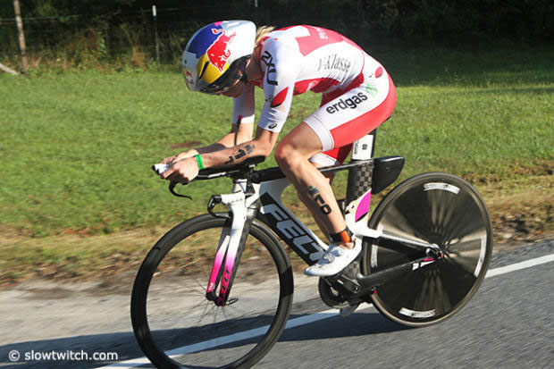 Last year, Daniela Ryf emerged 10th in the women’s swim wave, with a 52:50 split that put her just 14 seconds off the top. This year Lucy Charles and Lauren Brandon finish in 49 minutes and should put 3 minutes on Ryf, with Rachel Joyce 2 minutes further back and Sarah Crowley 2 more minutes arrears. While Ryf soldiers through the swim, she swallows a bit of sea water and starts the bike with an uncomfortable feeling.