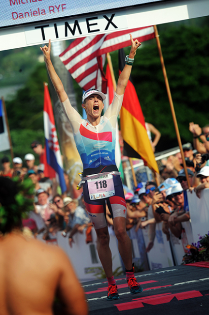 Retired four-time Kona winner Chrissie Wellington points to three-time winner Daniela Ryf at the finish.
