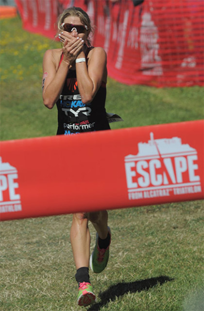 Lauren Goss is overcome with emotion as she approaches the finish of her victory at Escape From Alcatraz.