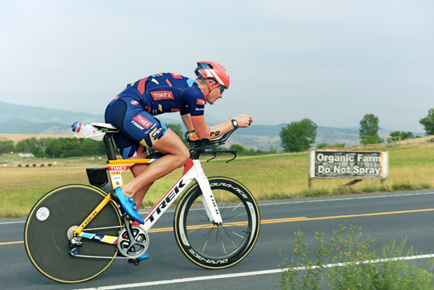 Justin Metzler rides past “Organic Farm – Do Not Spray” sign at Mile 25 of Ironman 70.3 Boulder course. Metzler rode 1:57:27 on his way to 4th place overall.