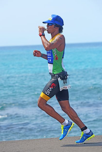 Thiago Vinhal of Brazil takes in nutrition running on Alii Drive on his way to 13th place at the Ironman World Championship.