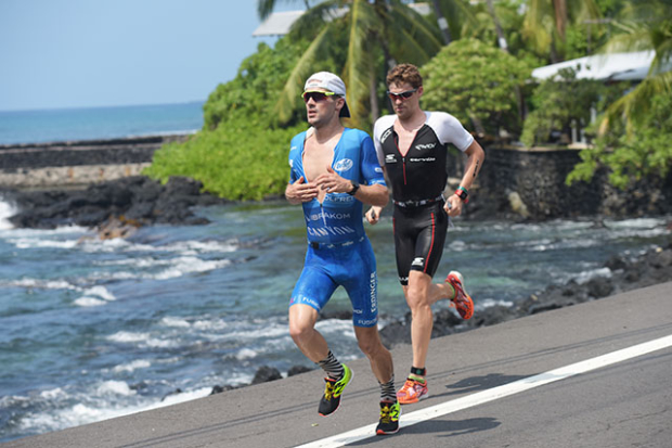 Eventual winner Patrick Lange and third place finisher David McNamee ran close together early on the run along Alii Drive at the Ironman World Championship in Kona.