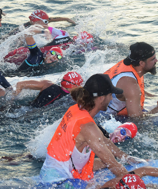 Pro women swim past lifeguards on surfboards who maintained order at the start line at the Ironman World Championship.