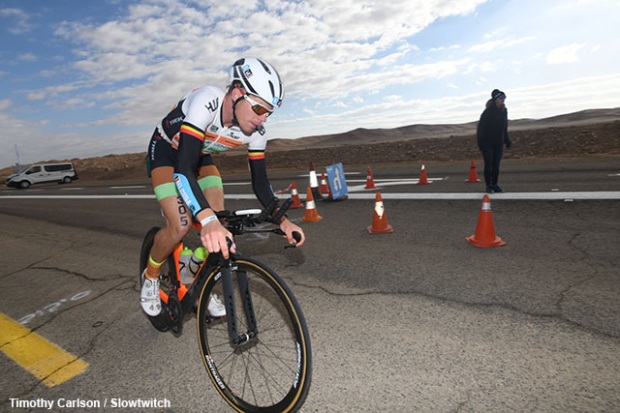 Hywel Davies of Great Britain was 2:42 behind Jilek to take the final spot on the podium. Davies, who is 43, looks rugged like a special ops soldier but had no embarrassment talking about the fear he experienced riding in the high winds. “I’ve never been so scared on the bike,” he said. “Into the wind you grind it out. Running with the wind you get free speed. And you take it into downhill and you hang on for dear life with the side winds. It was super hard.”