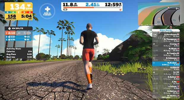 This is the view from behind looking at the TV screen where the Zwift app is running. My Wahoo Kickr is sitting right in front of the treadmill, with maybe 5 feet of space between them.