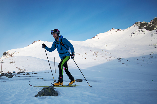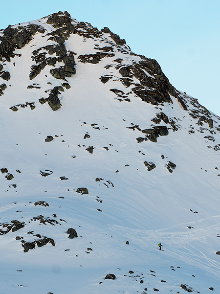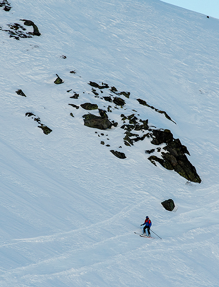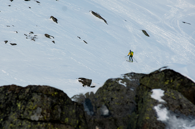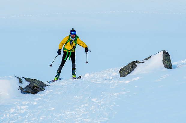 Ronnie Maas Pedersen showing his descending skills in front of a spectacular background.