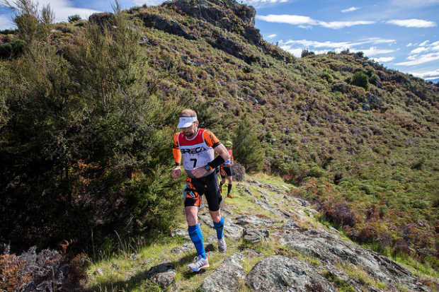 Jeff McGrath and Merv Hunger running on a ridge with no other competitor in sight. At the end they had 11 minutes on the closest competition.