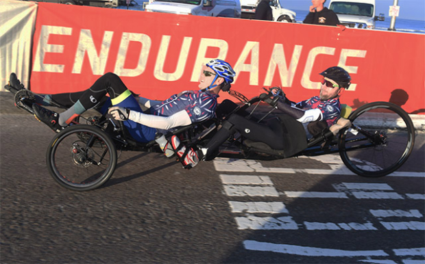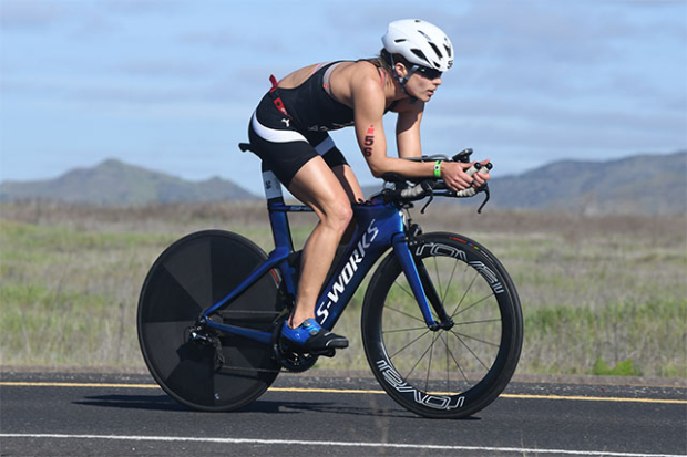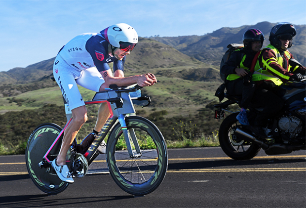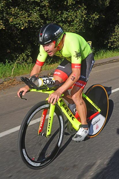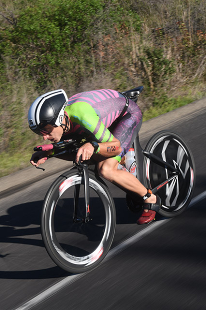 Kennett Peterson goes aero on his way to a 4th-best 2:12:47 bike split and 8th place overall.
