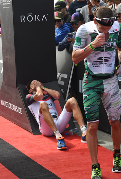 Jan Frodeno looked triumphant at the finish, but a few minutes later he showed signs of the effort.