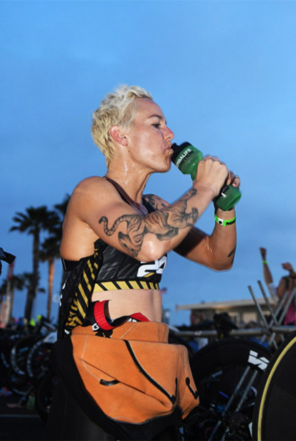 Heather Jackson hydrates before the race. She swam 27:28, biked 2:26:36 and ran 1:25:16 for 4th place.