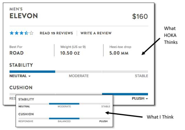 HOKA hit it exactly right in this shoe’s forefoot cushion. Where HOKA is getting some grief is in the rearfoot. Here are excerpts from the first 4 reviews (as of this writing) of the Elevon on HOKA’s website: