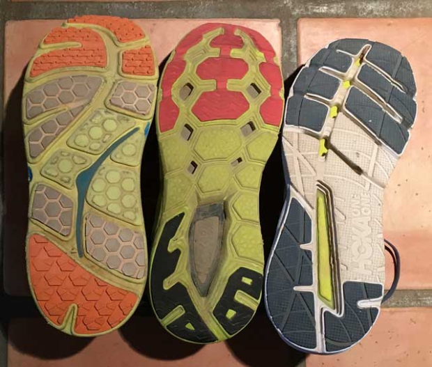 After three iterations the Vanquish has given way to the Elevon. Above at left is the original Bondi B. In the middle is the Vanquish 2. At right is the new Elevon and what all 3 of these shoes share is a narrow, but not too narrow (the original HOKA Conquest), outsole pattern that hits the sweet spot where stability and freedom-of-motion meet.