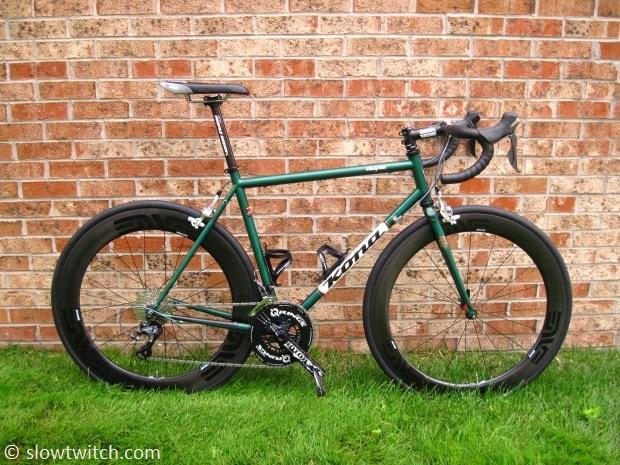 Well, to say that the performance of that bike was 'transformed' with the wheel/tire swap would be an understatement. The bike was always one of my favorites for descending (more due to geometry than anything else), but now on fast group rides I had no problems keeping up, and on longer rides it was VERY comfortable and stable. About the only place it lacked performance-wise was when the road tilted up, but seeing as how it weighs ~22 lbs (with most of that extra weight in the steel fork), that's to be expected. Heck, I even successfully raced a few crits on it during that time frame…talk about shocking people following you when you reach down to shift during a race 😉