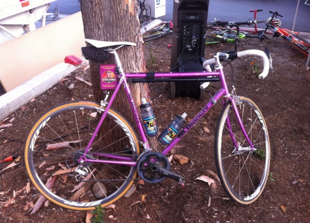 Then, something very unfortunate happened – Tom’s garage was burglarized and his beautiful S5 was stolen along with several other bikes. The thieves decided to do him a favor, however, and left behind his 1986 Bianchi Sport SX (which is a Japanese-built steel frame, according to Tom). Until he could deal with insurance and get a new bike, this was his only ride.